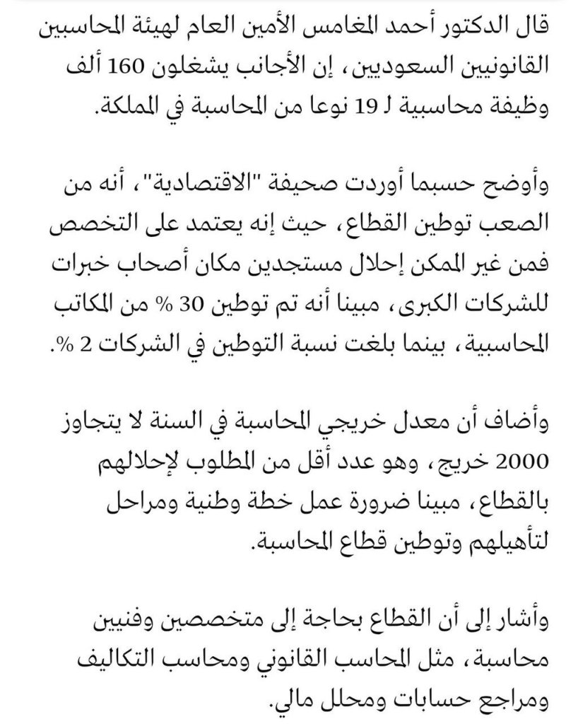 ارفقت في نهاية هذا المقال بعض الحديث من أشخاص مختلفيين، الأولى كانت لأمين عام الهيئة السعودية للمحاسبين القانونيين: د. أحمد المغامس